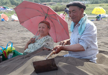 Visitors receive the sand therapy clinic in Turpan, Northwest
