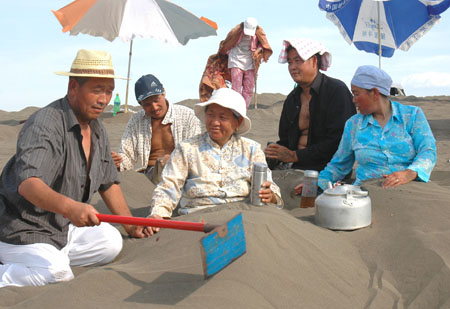 Visitors receive the sand therapy clinic in Turpan, Northwest