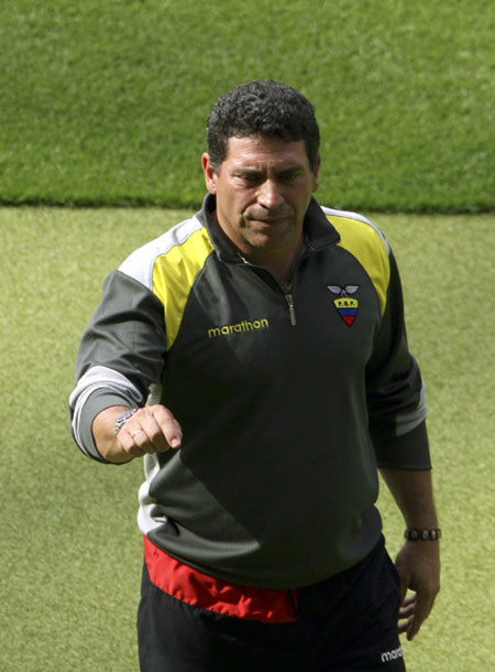 Ecuador coach Luis Suarez gestures during World Cup soccer training in Berlin June 19, 2006. [Reuters]