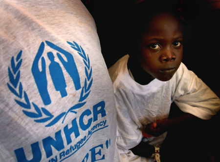 U.N. lorry to a transit centre in his native Liberia on World Refugee Day, June