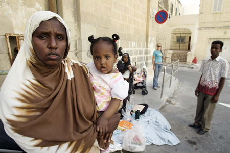 A Somali immigrant mother holds her child outside the Malta Police Headquarters in Floriana, outside Valletta, on World Refugee Day June 20, 2006. A group of Somali immigrants have set up camp right outside the entrance to the police headquarters in protest after they were moved out of their accommodation. Police sources said they will be given alternative accommodation within the police headquarters itself.[Reuters]