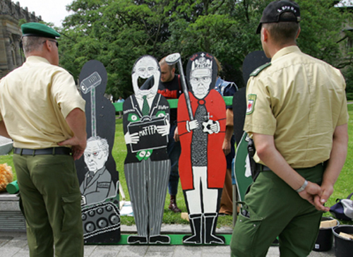 German police watch protesters as they remove cardboard portraits depicting