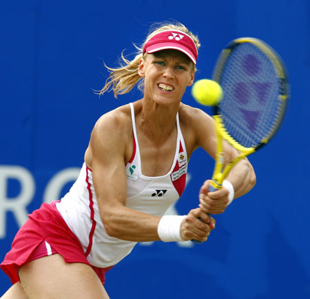 Elena Dementieva of Russia returns the ball to Michaella Krajicek of The