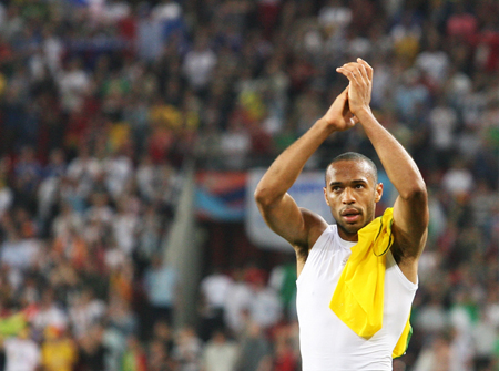 France's Thierry Henry acknowledges the crowd after France defeated Togo in their Group G World Cup 2006 soccer match in Cologne June 23, 2006. [Reuters]