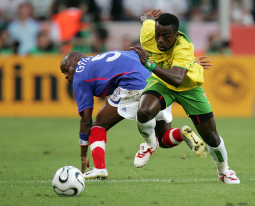 Togo's Mohamed Kader Coubadja (R) runs for the ball next to France's William Gallas during their Group G World Cup 2006 soccer match in Cologne June 23, 2006. [Reuters]