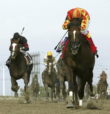 Jockey Emile Ramsammy guides Edenwold (R) to victory past Malakoff and jockey Todd Kabel (L) in the 147th running of the Queen's Plate horse racing stakes in Toronto June 25, 2006.[Reuters]