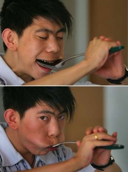 A combination picture shows stuntman Zhang Dong putting a huge spoon in