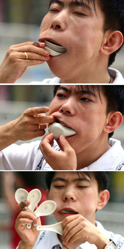 A combination picture shows stuntman Zhang Dong taking six spoons