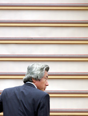 Japanese Prime Minister Junichiro Koizumi walks up stairs as he boards his special flight for Canada and the U.S. at Tokyo's Haneda airport June 27,2006. Japan's Prime Minister Junichiro Koizumi started a farewell visit to North America during which he will mix serious political talks with heavyweight tourism to Niagra Falls and Elvis Presley's home, AFP reported.