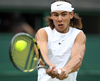 Spain's Rafael Nadal plays a shot to Robert Kendrick of the U.S. during their match at the Wimbledon tennis championships in London June 29, 2006. [Reuters]