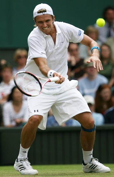Robert Kendrick of the U.S. plays a shot to Spain's Rafael Nadal during their match at the Wimbledon tennis championships in London June 29, 2006. [Reuters]