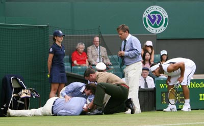 Spain's Rafael Nadal (R) looks at a line judge who collapsed