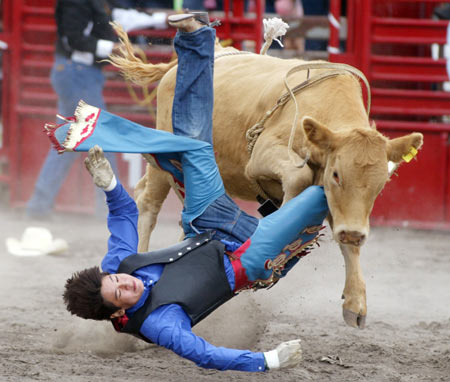 Cowboy Cirus Wesley is bucked off a steer during the Steer Riding event at the annual three-day Chiniki First Nations Canada Day Rodeo in Morley, Alberta, July 2, 2006. [Reuters]