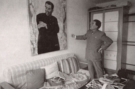 Wang Dong, who plays Chou Enlai, looks at a painting he made of the former premier in his house.