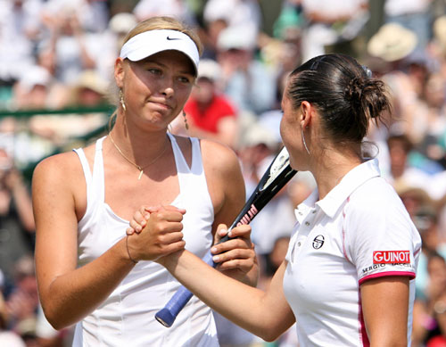 Stars shine at wimbledon (Reuters) Updated: 2006-07-04 09:23  Russia's Maria Sharapova (L) shakes hands with Italy's Flavia