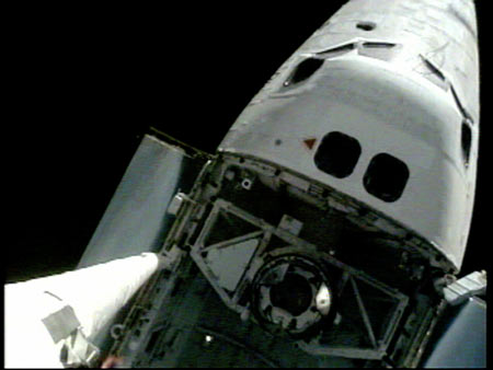 special cameras attached to a 50-foot boom examine the spacecraft for damage