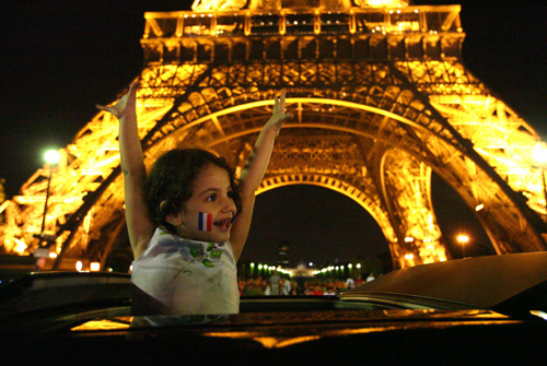 A France soccer team supporter celebrates in front of the Eiffel tower in