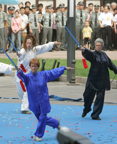 The martial arts team from the Netherlands performs during an event at the Fourth Beijing 2008 Olympic Cultural Festival in Beijing July 13, 2006. [Reuters]