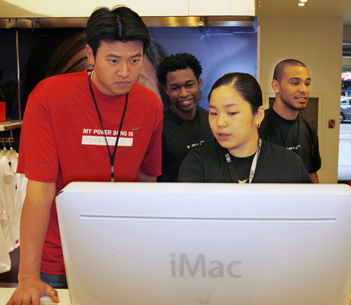 Lee (R) shows how the new "Nike + iPod Sports Kit" data uploads into a computer