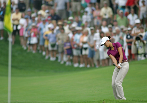 Michelle Wie of the U.S. chips onto the 12th green during the first round of the John Deere Classic golf tournament in Silvis, Illinois, July 13, 2006. [Reuters]