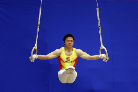 China's Chen Yibing performs during the men's rings final of the Shanghai FIG World Cup gymnastics competition in Shanghai July 15, 2006.[Reuters]
