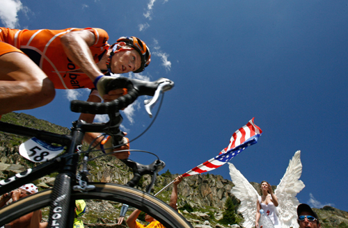 Rabobank's team rider Mickael Rasmussen of Denmark cycles in the Alps during