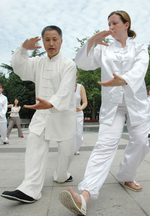 A Kungfu trainer (L) teaches the shadowboxing to a British student on 18 July. Dozens of overseas students learn Kungfu in Suzhou Park.[Xinhua]