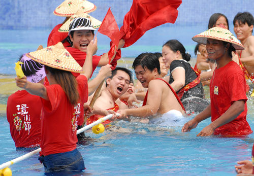 Visitors join a game named "Water Tug-of-War" in China Folk Culture Village of Shenzhen.Tourists around the country enjoy the water interesting sports. [Xinhua]