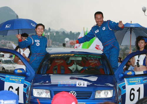 and his co-driver Hao Xiaohong stand on the awarding platform after grabbing the