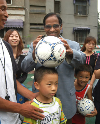 Peter Velappan, secretary general of the AFC (Asian Football Confederation), signs on a ball for a little soccer fans of an elementary school in Nanjing.[Xinhua]