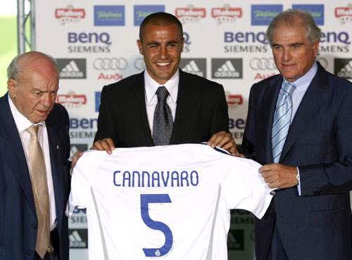 Real Madrid's new soccer player Fabio Cannavaro of Italy holds his jersey flanked by Real Madrid president Ramon Calderon (R) and club's honorary president Alfredo Di Stefano (L) during his presentation ceremony at Santiago Bernabeu stadium in Madrid July 25, 2006.[Reuters]