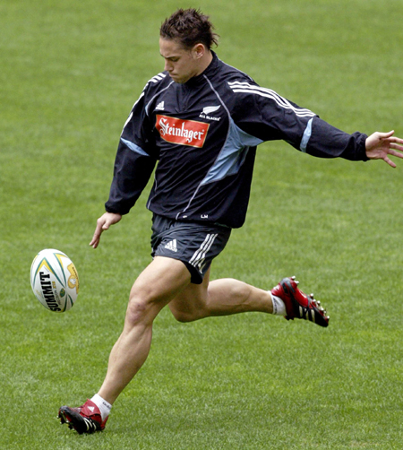 New Zealand player Luke McAlister kicks at the Captain's Run in preparation for the Bledisloe Cup rugby union test match at Lang Park in Brisbane July 28, 2006. [Reuters]