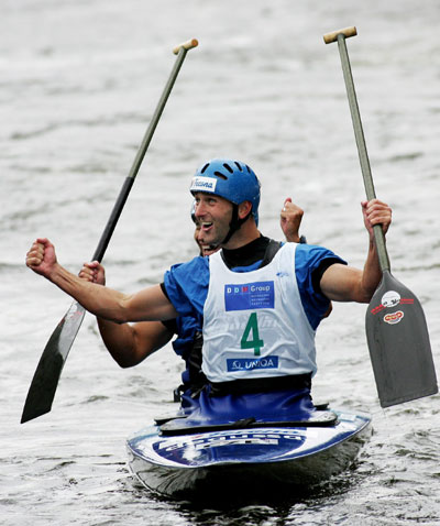 Czech Republic's Jaroslav Volf (front) and Ondrej Stepanek celebrate after winning the C2 men race at the ICF Canoe/Kayak Slalom Racing World Championships 2006 in Prague August 5, 2006.[Reuters]
