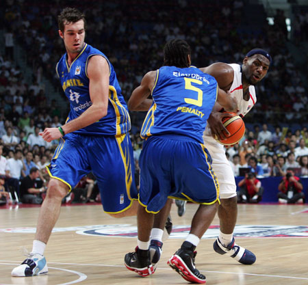 LeBron James (R) of the U.S. basketball Men's Senior National Team is guarded by Brazilian players during the China Basketball Challenge at the Guangzhou Gymnasium, south China's Guangdong province, August 8, 2006.[Reuters]