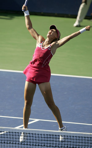 celebrates her win over Serbia's Jelena Jankovic in the final of the JPMorgan