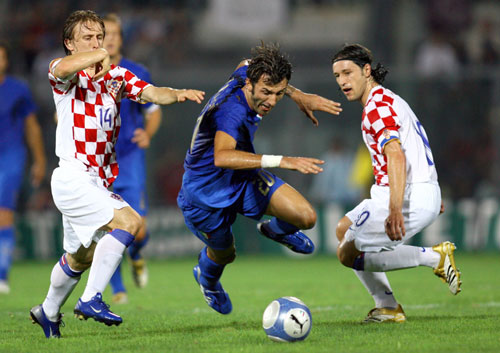 Italy's Gennaro Delvecchio (C) is challenged by Croatia's Nivo Kovac (R) and Luka Modric during their friendly soccer match at the Armando Picchi Stadium in Livorno, Italy, August 16, 2006.[Reuters]