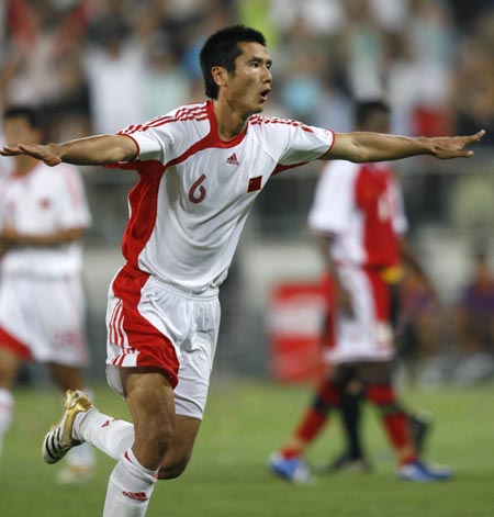 Chinese player Shao Jiayi celebrates after his last-gasp pivotal peanalty kick gave China a 1-0 win over Singapore at an Asian Cup qualifier in Tianjin Wednesday. [Xinhua]