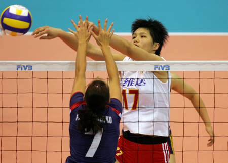 China's Xu Yunli (top) spikes the ball against Azerbaijan's Yelena Parkhomenko during their FIVB World Grand Prix preliminary match in Hong Kong August 19, 2006. [Reuters]