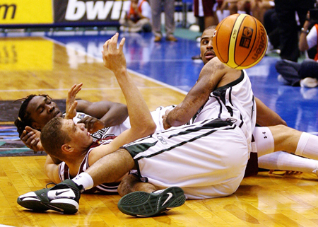 Venezuela's Richard Lugo (C) struggles for the ball with Nigeria's Ime Udoka (R) and Jeff Varem during their match at the world basketball championships in Sendai August 20, 2006. [Reuters]