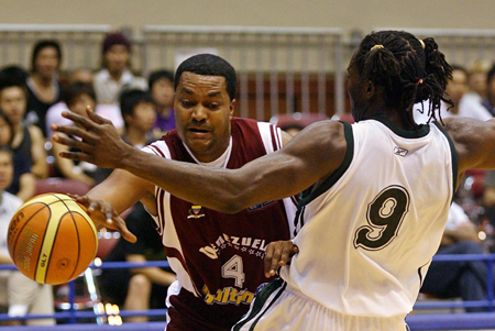 Venezuela's Victor Diaz (L) drives the ball pass Nigeria's Jeff Varem during their match at the world basketball championships in Sendai August 20, 2006. [Reuters]