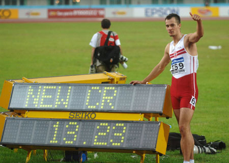 Poland's Artur Noga wins the gold with 13.23 seconds at men's 110m hurdles final of the 11th IAAF World Junior Championships in Beijing August 20, 2006. [Reuters]