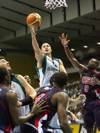 Slovenia's Marko Milic (top, C) goes up to shoot as Dwyane Wade (R) of the