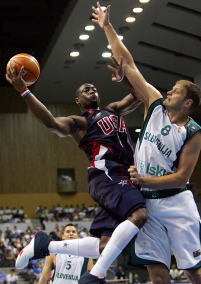 Dwyane Wade of the U.S. (C) goes up to shoot against Slovenia's Radoslav
