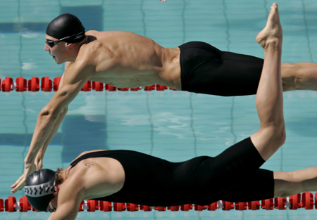 Austria's Dinko Jukic (top) and Serbian and Montenegro's Ivan Lendjer start the semi-finals of the men's 100m butterfly at the FINA Youth World Swimming Championships in Rio de Janeiro August 23, 2006. [Reuters]