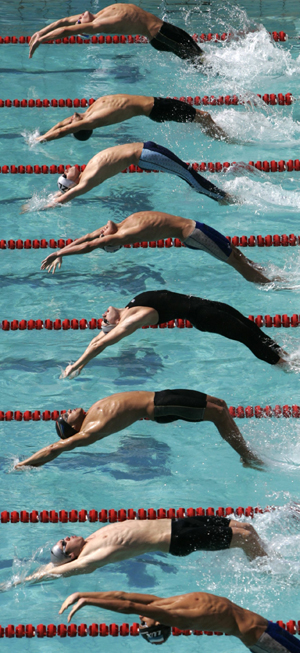 Swimmers start the semi-finals of the men's 100m backstroke at the FINA Youth World Swimming Championships in Rio de Janeiro August 23, 2006.[Reuters]