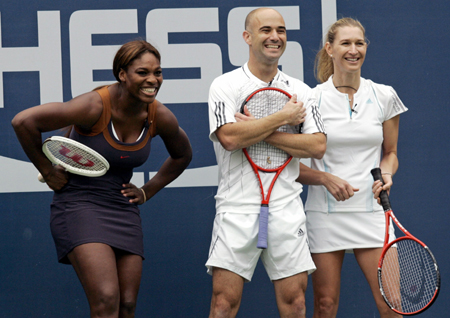 Andre Agassi (C) and his wife Steffi Graf (R) share a laugh with Serena