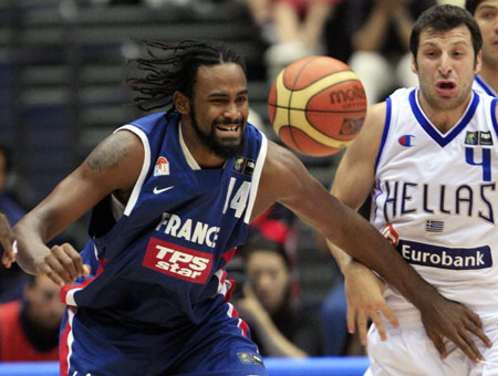 France's Ronny Turiaf (L) and Greece's Theodoros Papaloukas fight for a ball