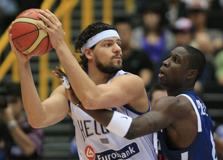 Greece's Lazaros Papadopoulos (L) is defended by France's Mickael Pietrus