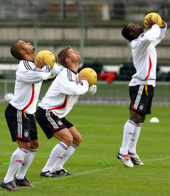 David Odonkor, Thomas Hitzlsperger and Gerald Asamoah (L-R) exercise during a