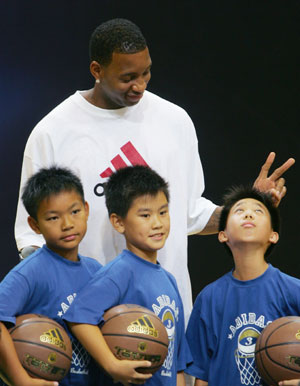 NBA Houston Rockets star Tracy McGrady (T-Mac) poses with young basketball players during his Asian trip in Hong Kong August 31, 2006.[Reuters]